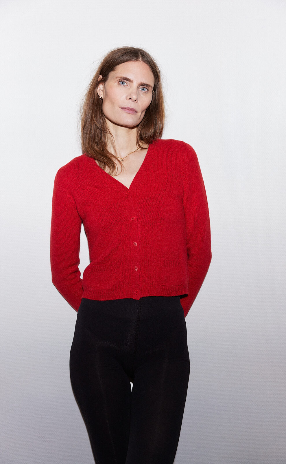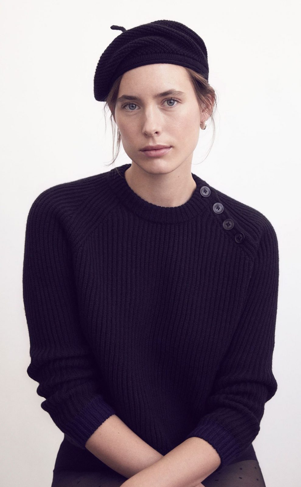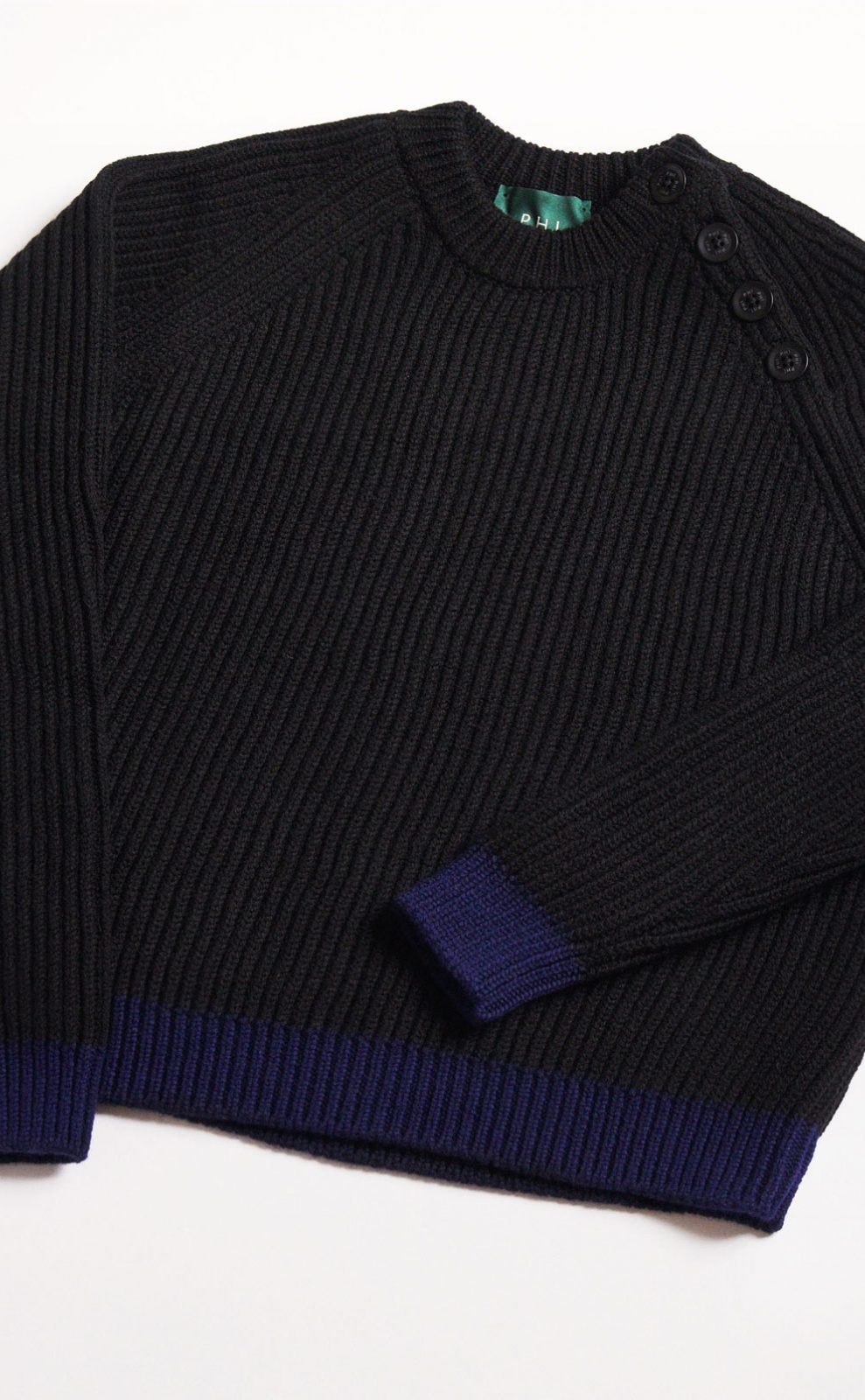 The sweater has a slim fit and a round neckline with corozo nut buttons on the shoulder.