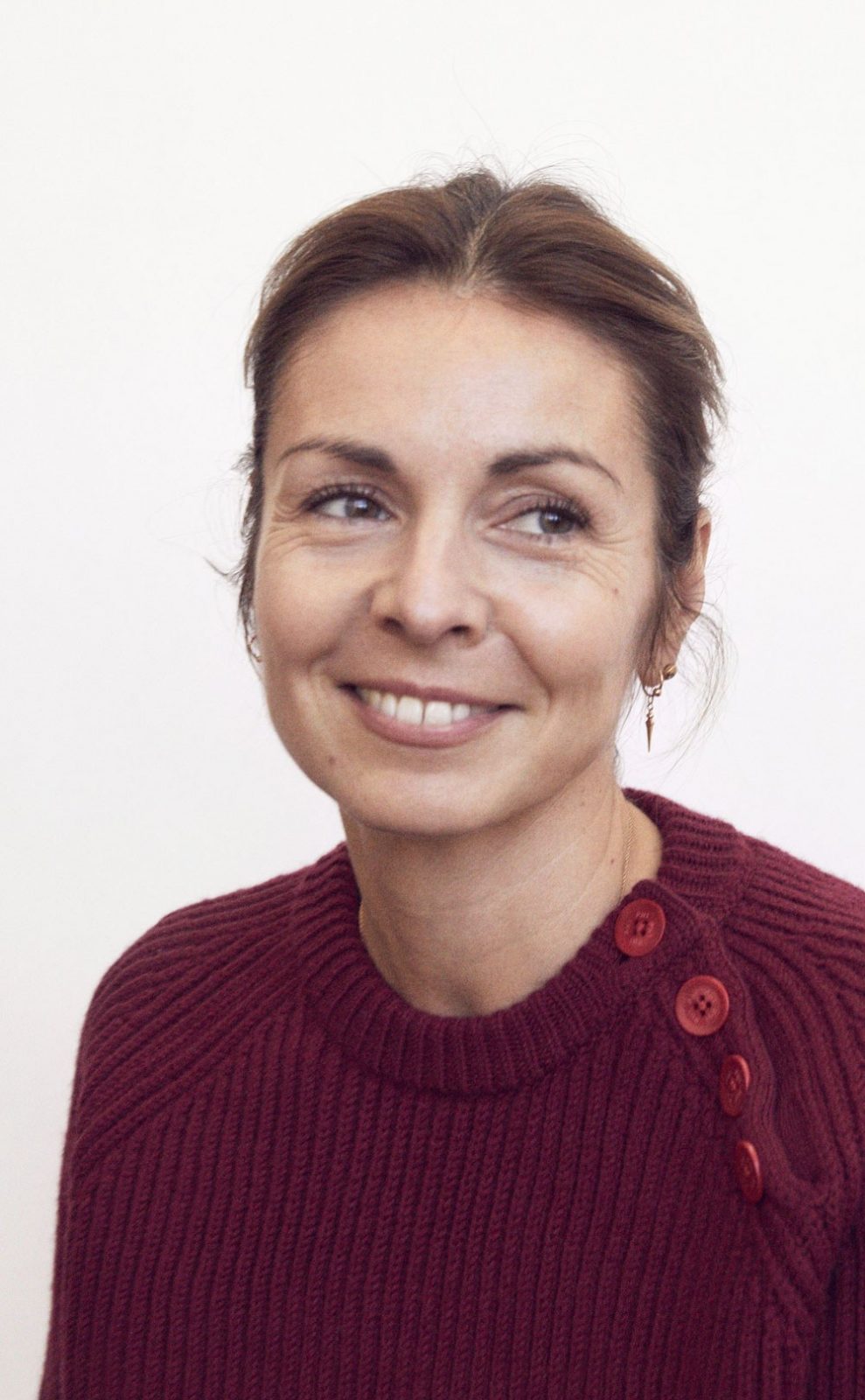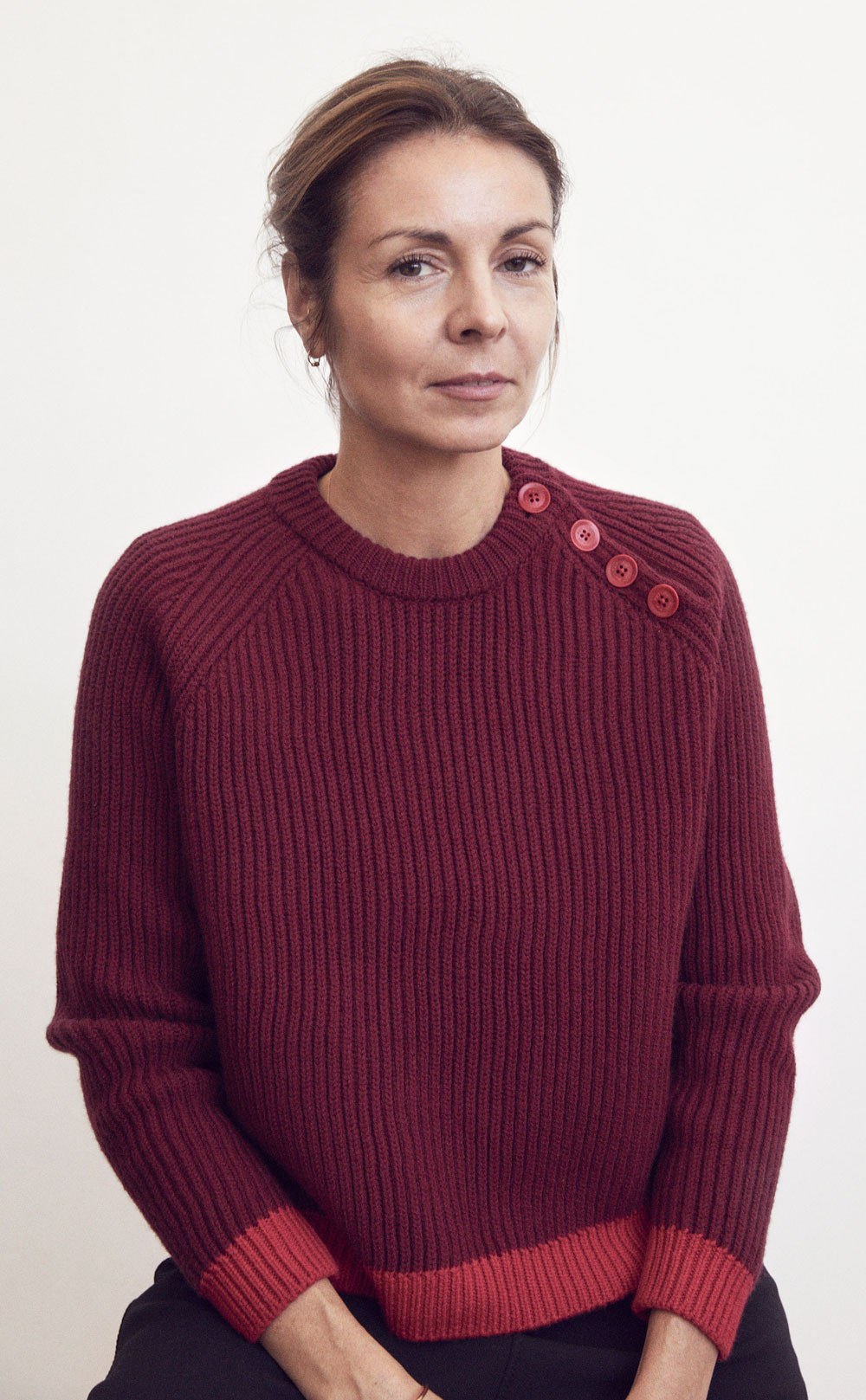 The sweater has a slim fit and a round neckline with corozo nut buttons on the shoulder.