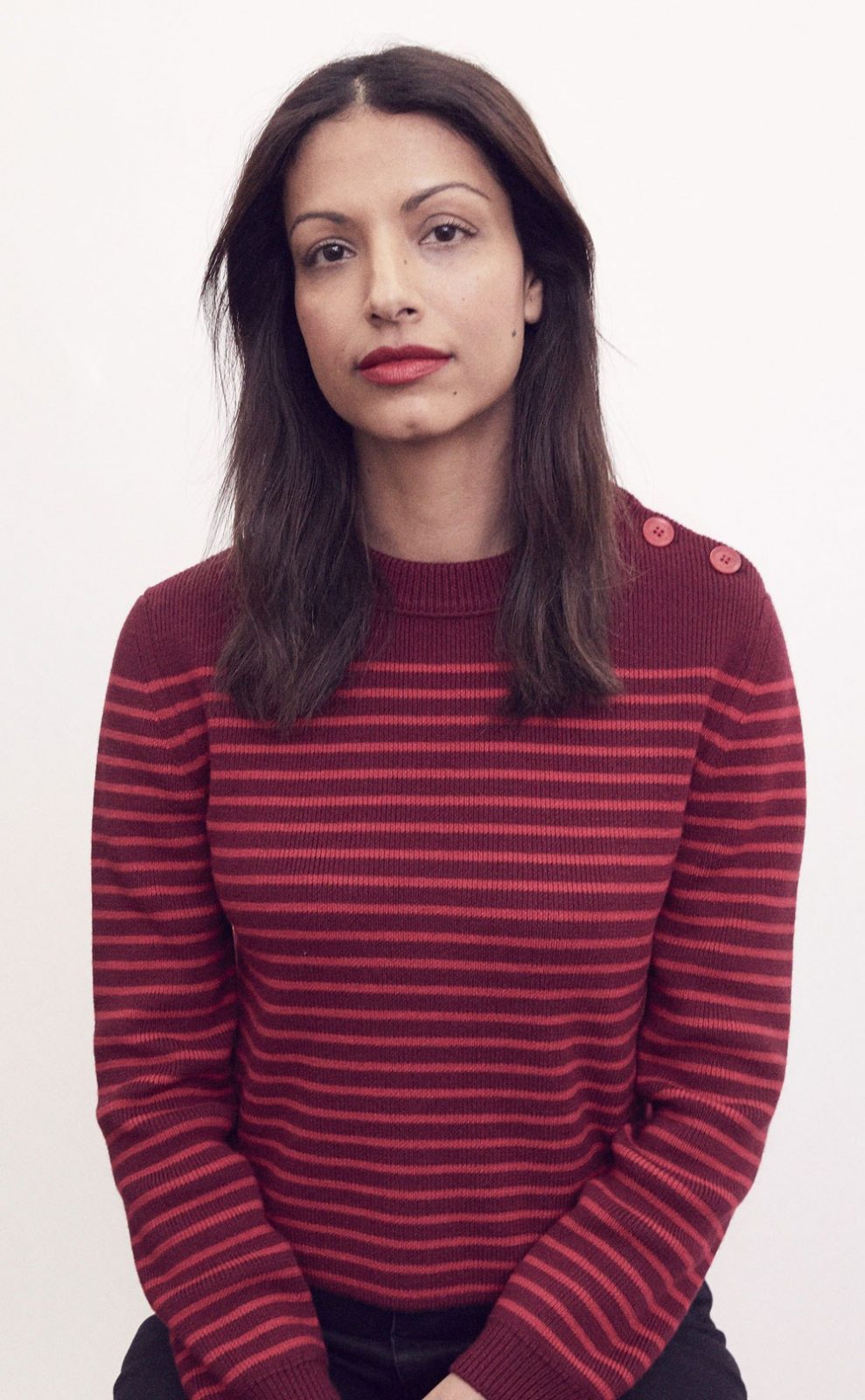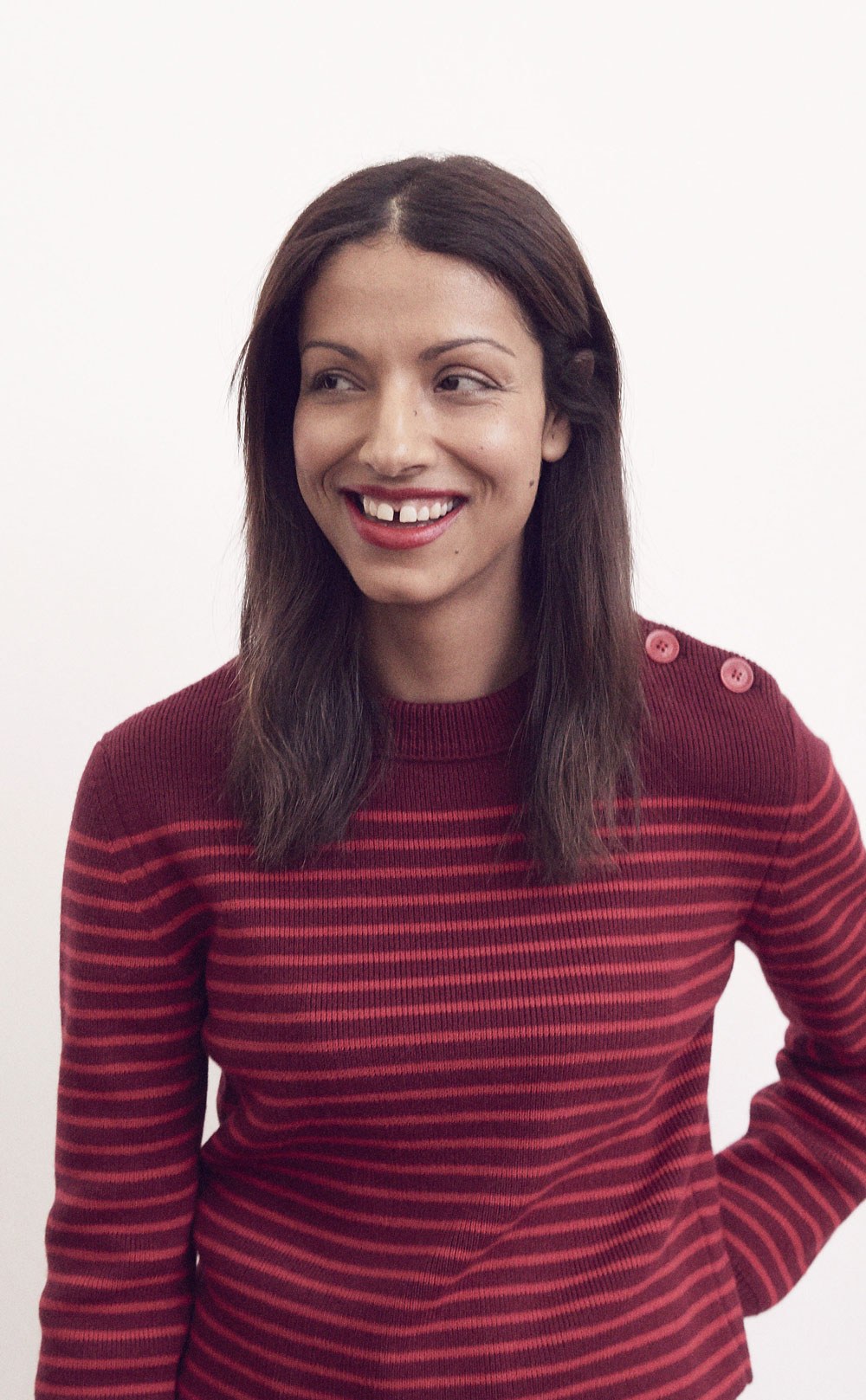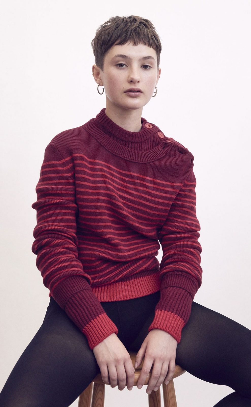 The sweater has a slim fit, horizontal stripes and a round neckline with corozo nut buttons on the shoulder.