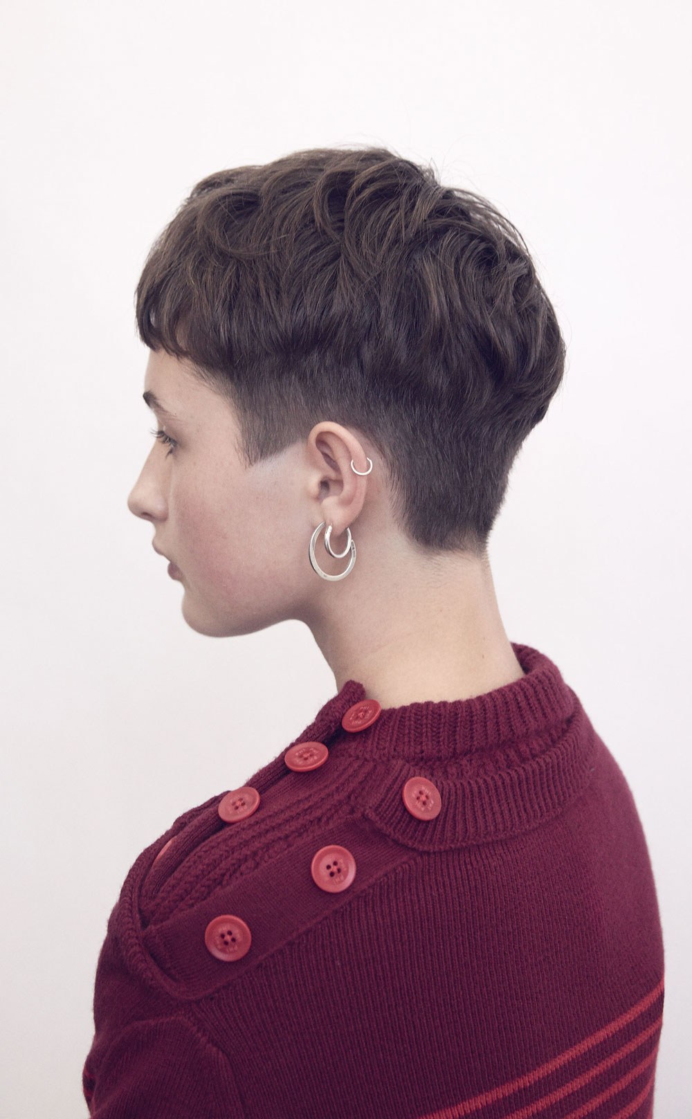 The sweater has a slim fit, horizontal stripes and a round neckline with corozo nut buttons on the shoulder.