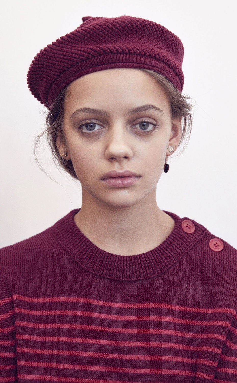 The sweater has a slim fit, horizontal stripes and a round neckline with corozo nut buttons on the shoulder.