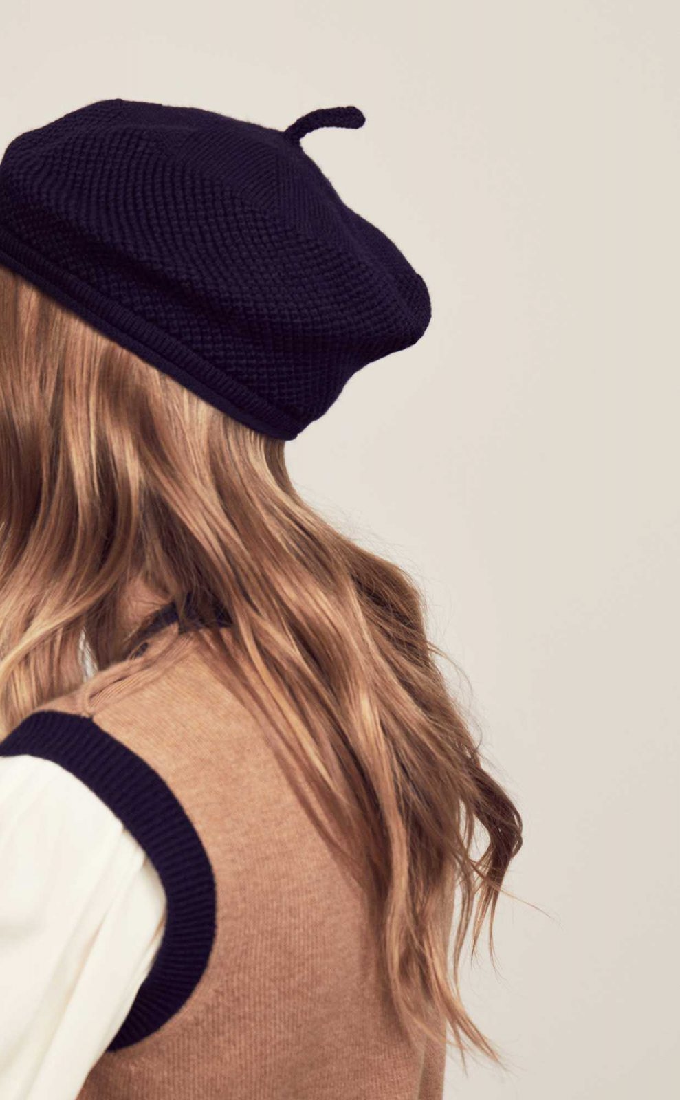 This vest is sleeveless with a straight fit and a round neckline, it features corozo nut buttons on the shoulder and a contrasting navy trim.