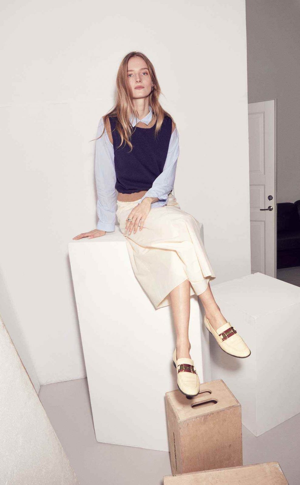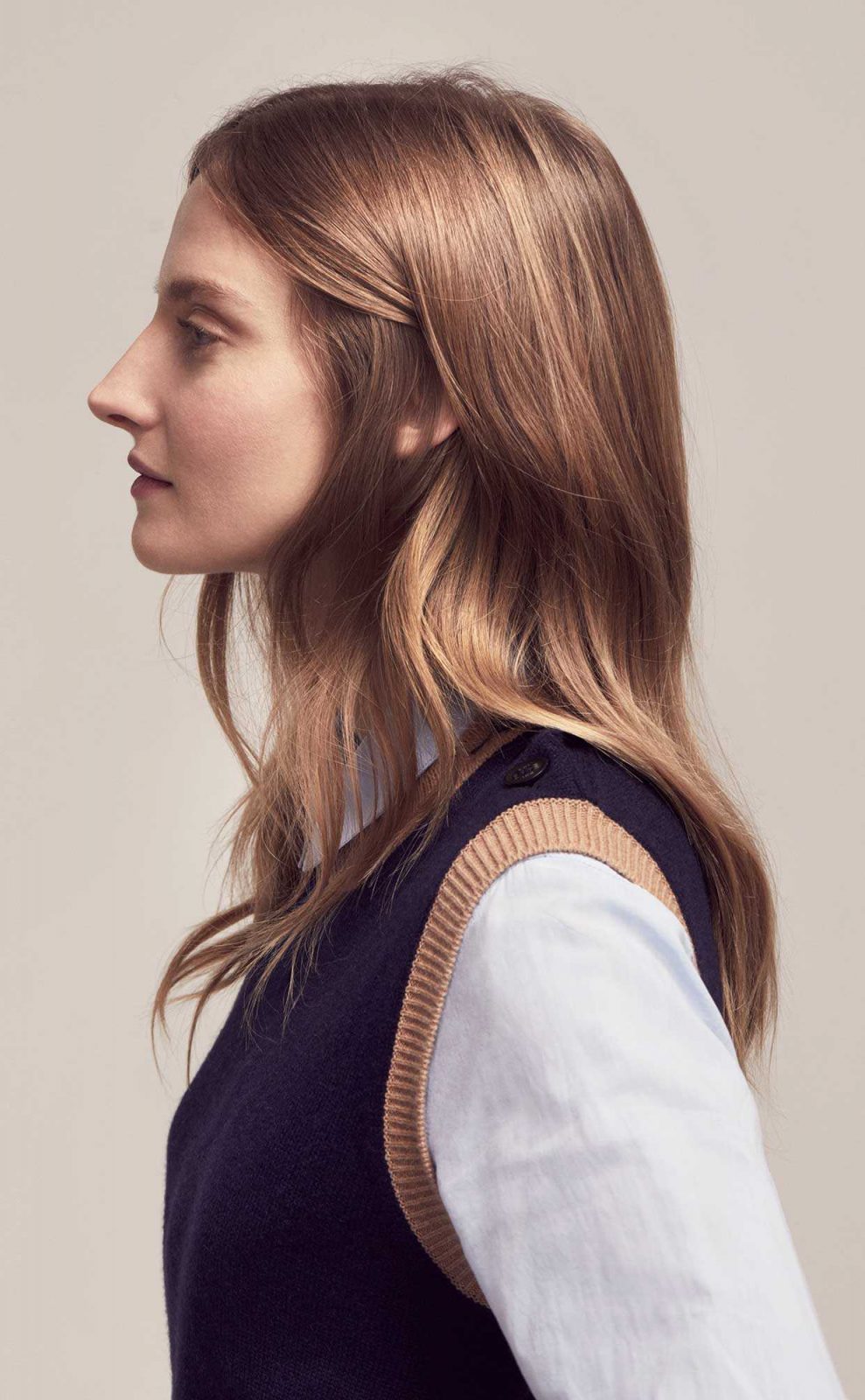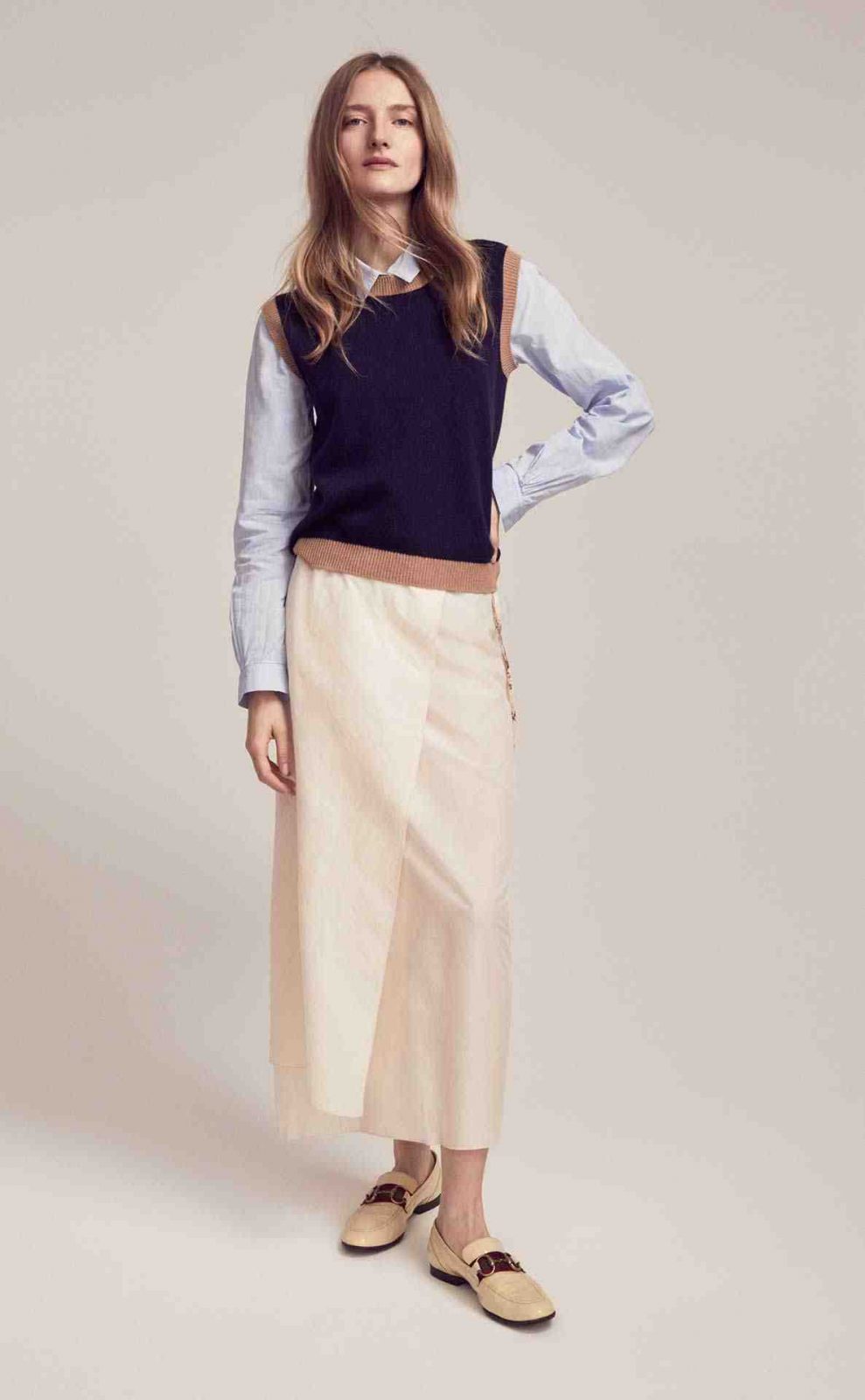This vest is sleeveless with a straight fit and a round neckline, it features corozo nut buttons on the shoulder and a contrasting camel trim.