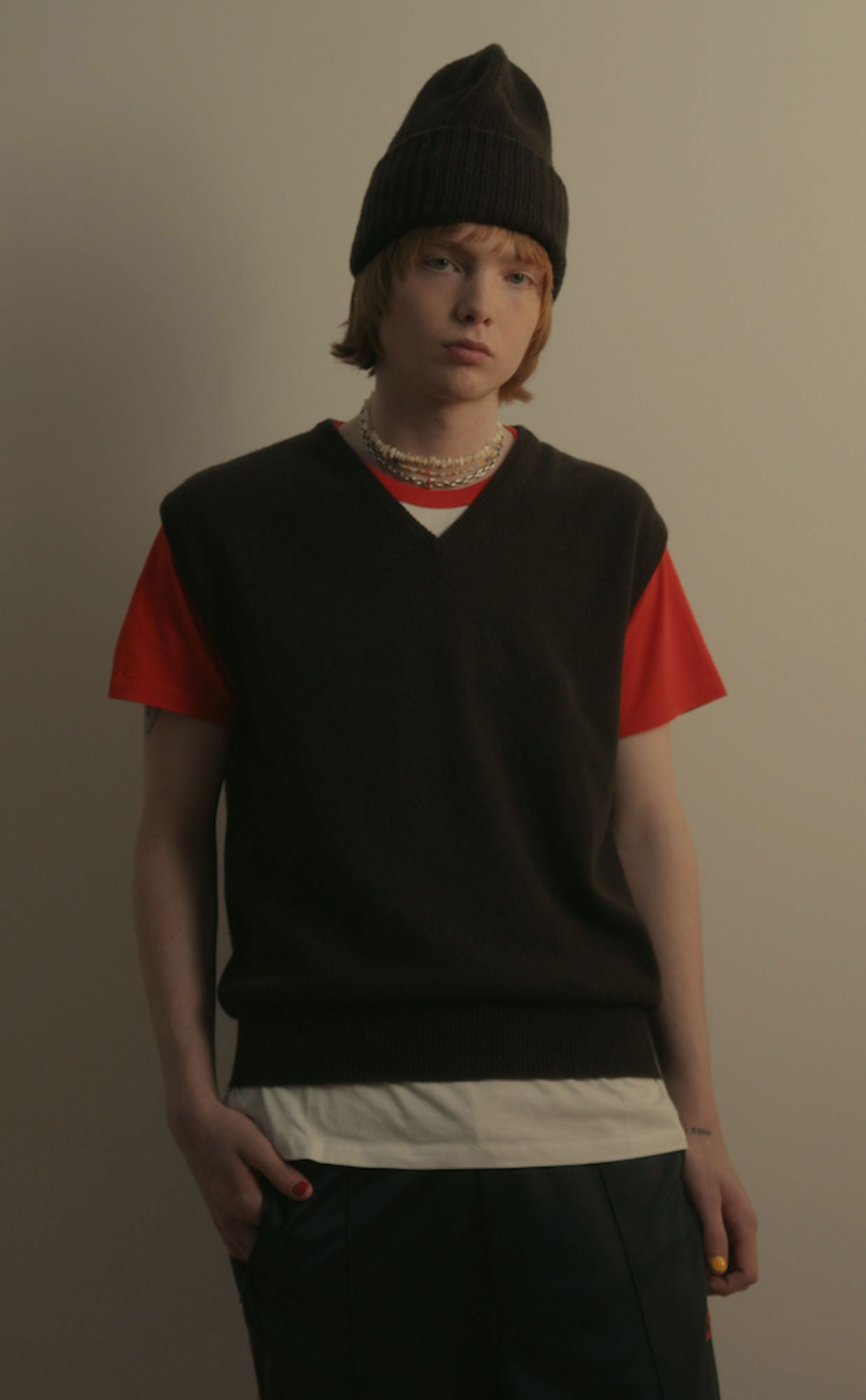 Made from soft, recycled cashmere, this v-neck vest is sleeveless with a relaxed fit.