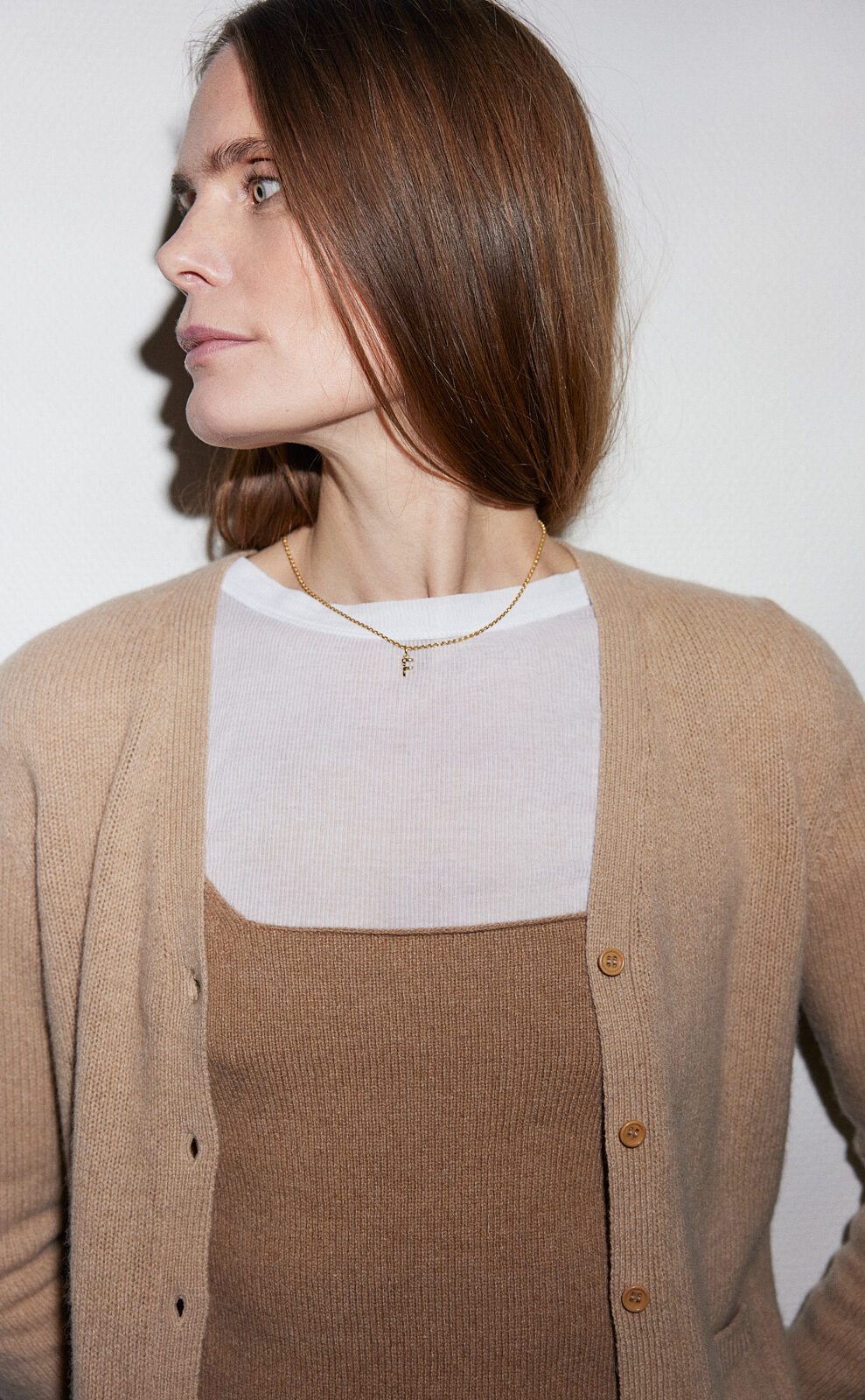 Milan v-neck cardigan comes in a slim fit with corozo nut buttons, made in soft recycled cashmere.